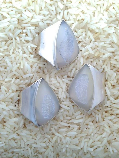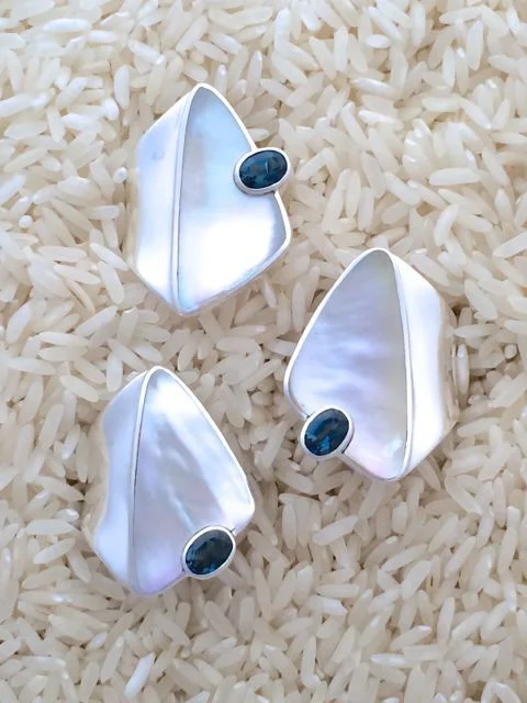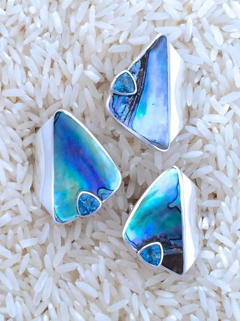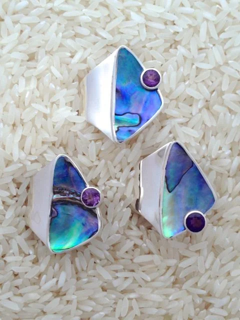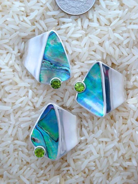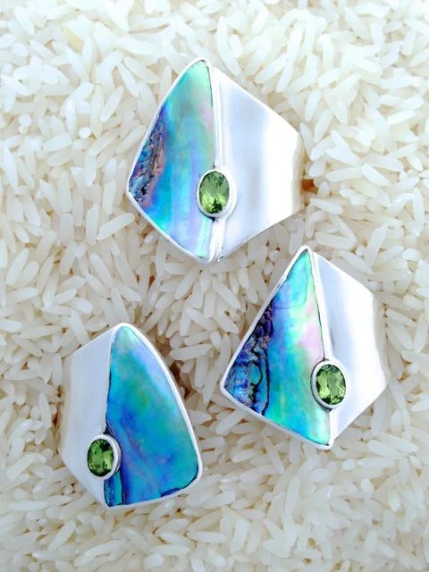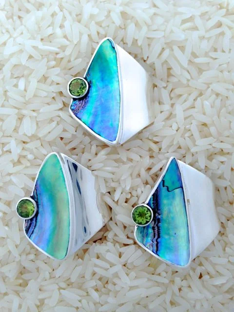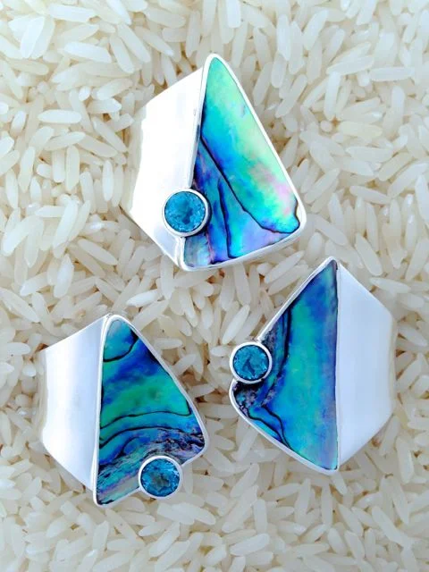 Every piece is adjustable, hand-made, and set in sterling silver - Basic samples including abalone, gold lip, black lip, spiny oyster, turquoise, and Larimar