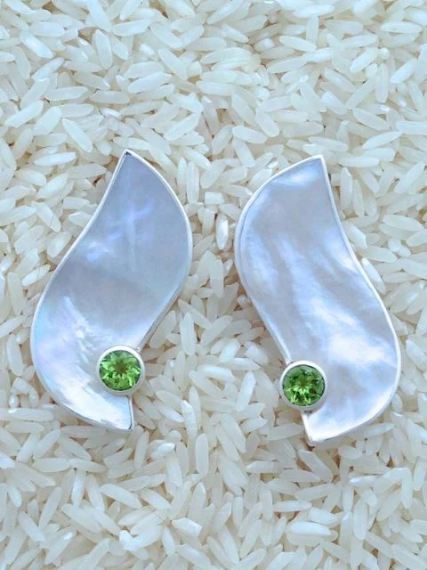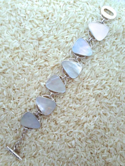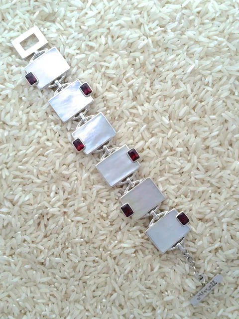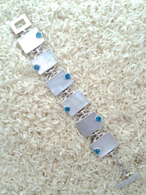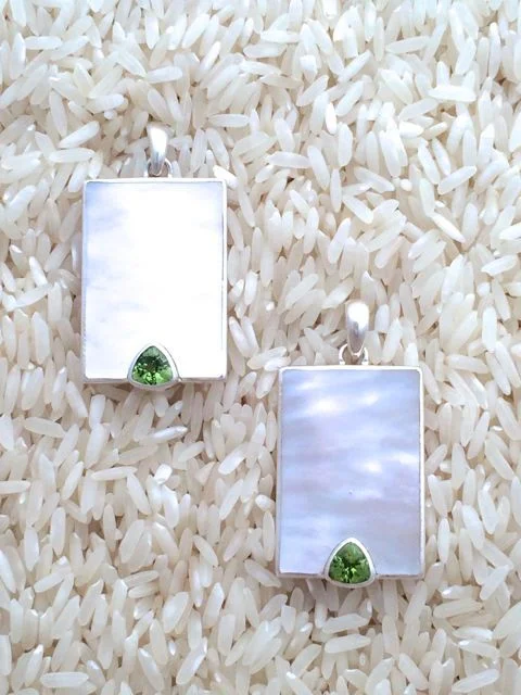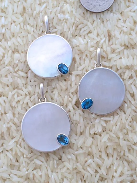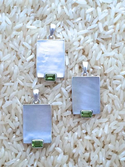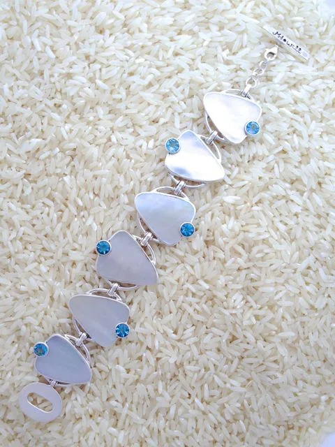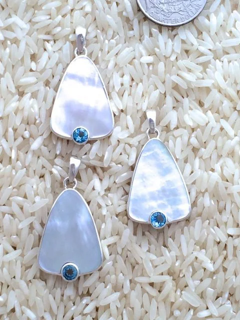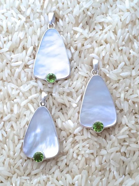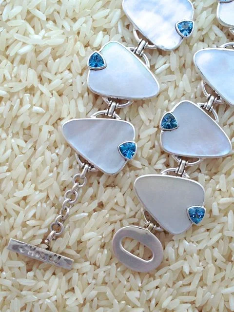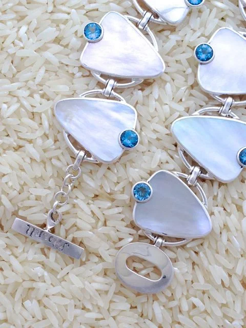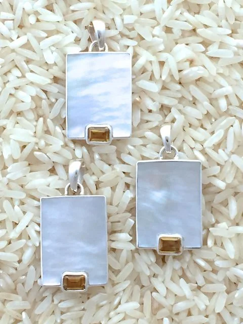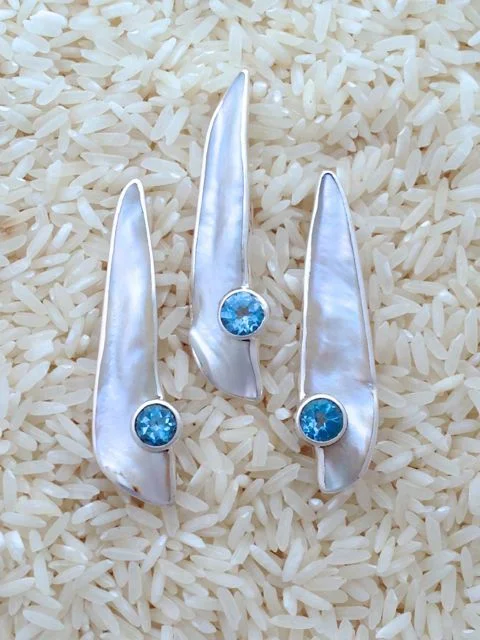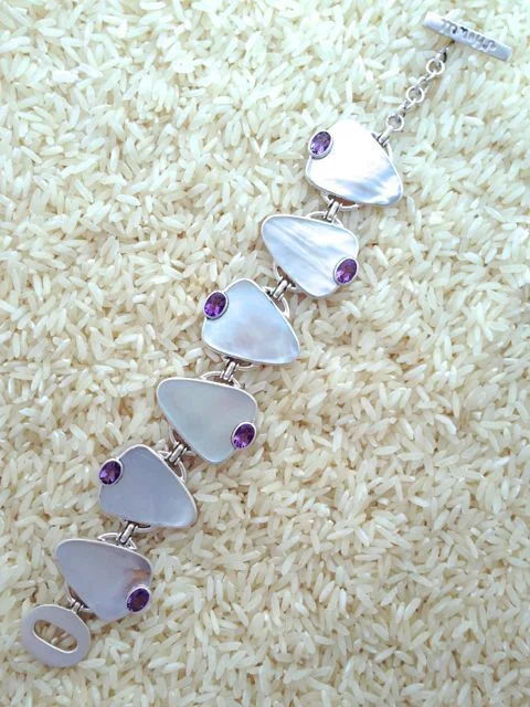 Designed with gold lip oyster, also known as mother of pearl, and accented with semi-precious gem stones